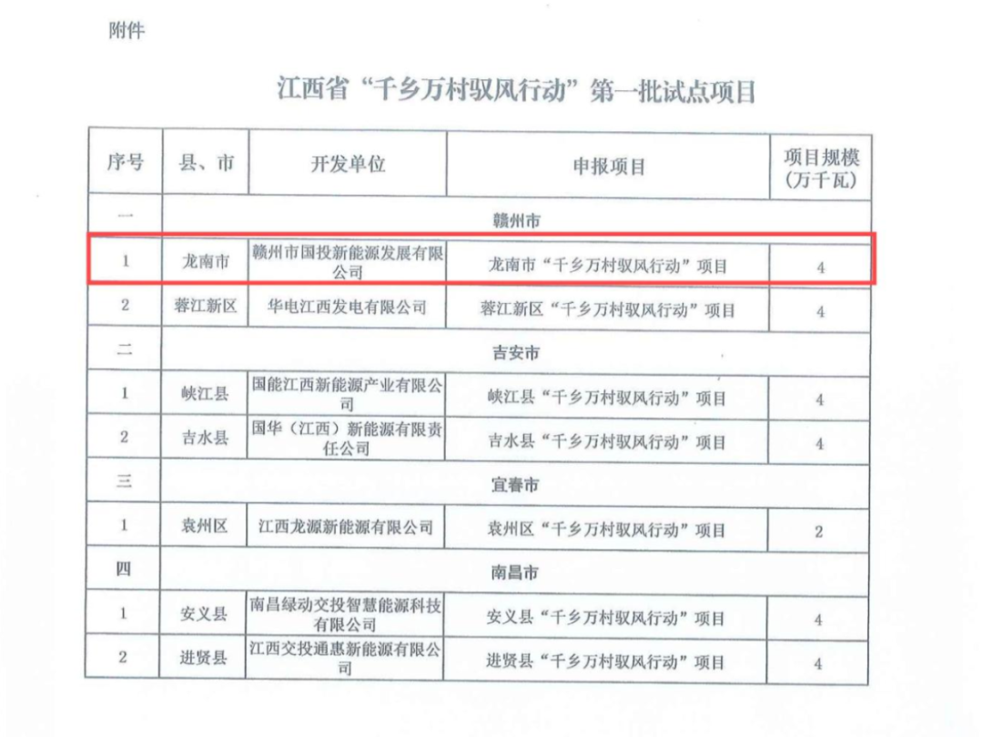 近日,江西省发展改革委、江西省能源局、江西省农业农村厅联合发布《关于下达江西省“千乡万村驭风行动”第一批试点项目的通知》(赣发改能源〔2025〕290号)。《通知》正式公布全省首批7个试点县(市、区)风电项目,总容量为260MW。