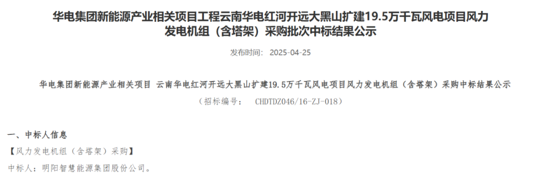 近日,华电集团电子商务平台发布重庆华电奉节高桥7.5万千瓦风电项目、黑龙江华电佳木斯汤原一期200MW风电项目、内蒙古华电孪井滩60万千瓦风光制氢一体化项目配套40万千瓦风电项目、云南华电红河开远大黑山扩建19.5万千瓦风电项目、黑龙江华电黑河北安建华20万千瓦风电项目、贵州华电松桃长兴、金海湖新区乌箐、安顺西秀岩腊、望谟郊纳风电项目31.25万千瓦、甘肃华电临夏州盐锅峡镇下铨村和通渭县孟河村、卢董村“千乡万村驭风行动”试点项目5万千瓦风力发电机组采购中标结果公示的公告。