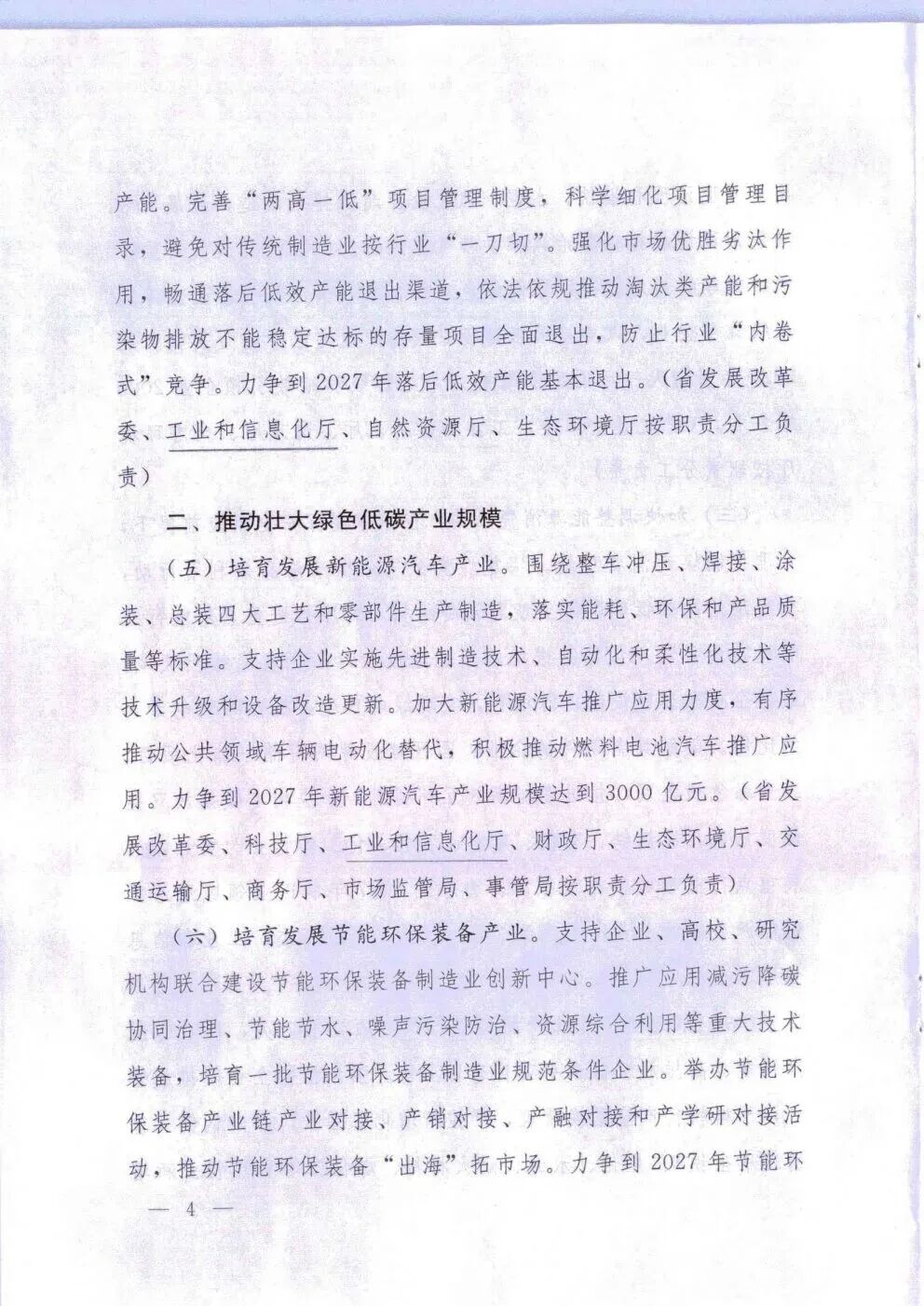 培育发展新能源汽车产业。围绕整车冲压、焊接、涂装、总装四大工艺和零部件生产制造,落实能耗、环保和产品质量等标准。支持企业实施先进制造技术、自动化和柔性化技术等技术升级和设备改造更新。加大新能源汽车推广应用力度,有序推动公共领域车辆电动化替代,积极推动燃料电池汽车推广应用。力争到2027年新能源汽车产业规模达到3000亿元。