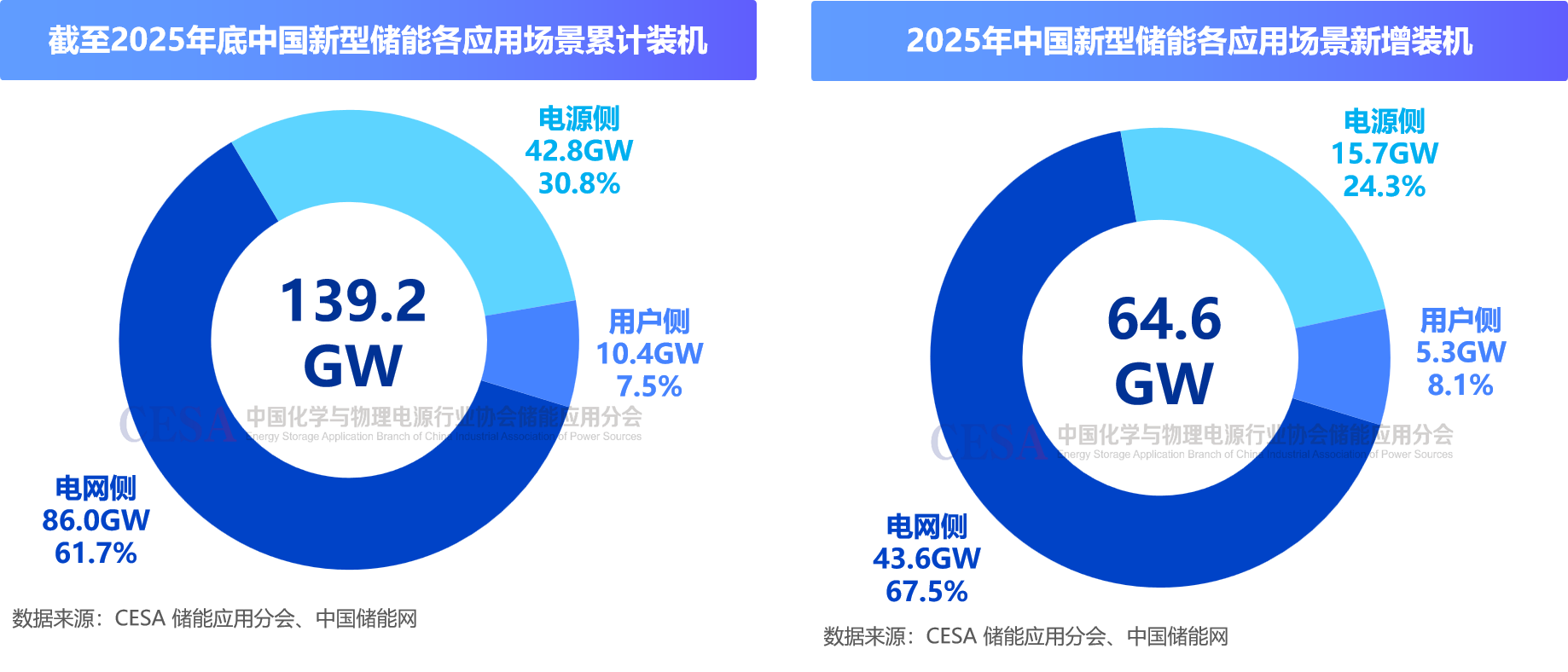 CESA储能应用分会数据显示,2025年,电网侧储能新增装机43.6GW/132.4GWh,占全国年度新增装机总量的67.5%(功率)/67.4%(容量),同比增长65.6%(功率)/104.2%(容量)。