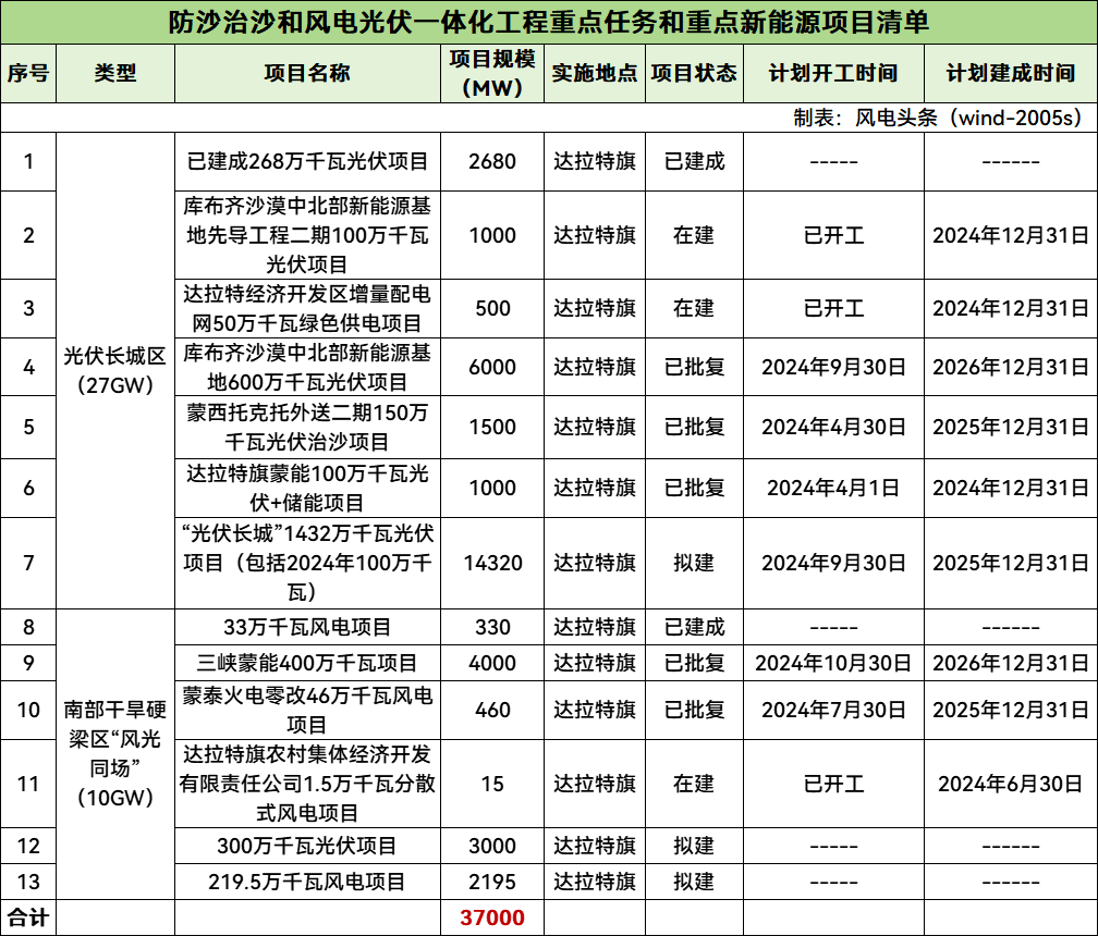 此外,《防沙治沙和风电光伏一体化工程重点任务和重点项目清单》显示,共有新能源项目13个,项目规模共计37GW。