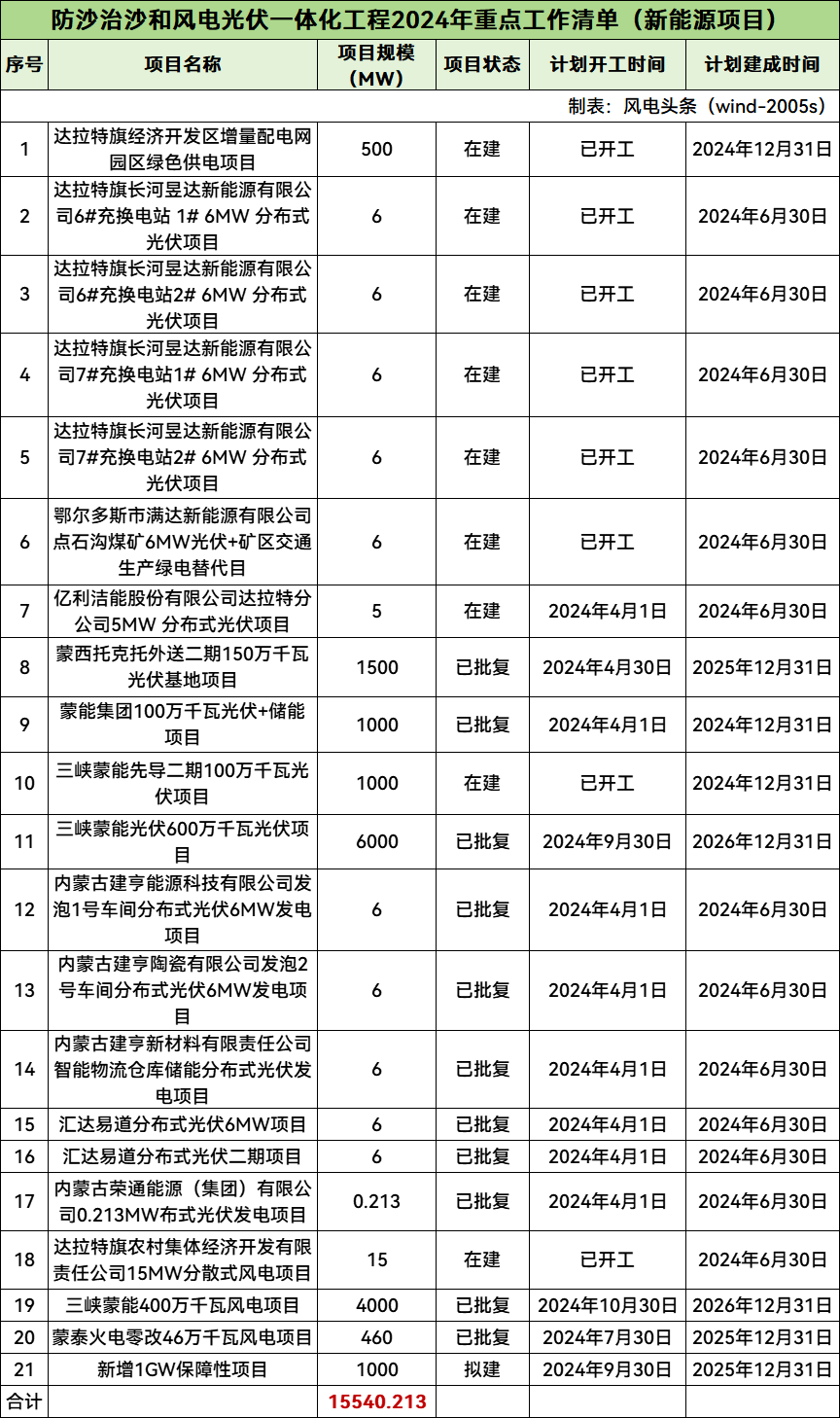 《防沙治沙和风电光伏一体化工程2024年重点工作清单》显示,2024年重点建设新能源项目21个,项目规模合计15.54GW。