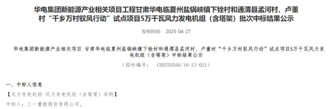 近日,华电集团电子商务平台发布重庆华电奉节高桥7.5万千瓦风电项目、黑龙江华电佳木斯汤原一期200MW风电项目、内蒙古华电孪井滩60万千瓦风光制氢一体化项目配套40万千瓦风电项目、云南华电红河开远大黑山扩建19.5万千瓦风电项目、黑龙江华电黑河北安建华20万千瓦风电项目、贵州华电松桃长兴、金海湖新区乌箐、安顺西秀岩腊、望谟郊纳风电项目31.25万千瓦、甘肃华电临夏州盐锅峡镇下铨村和通渭县孟河村、卢董村“千乡万村驭风行动”试点项目5万千瓦风力发电机组采购中标结果公示的公告。